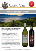 Le duo "Sélection Rochat" composé de 1 bouteille de Chasselas "Vinzel" 2016, AOC La Côte (70 cl) et 1 bouteille de Pinot Noir 2016, AOC Lavaux (70 cl).